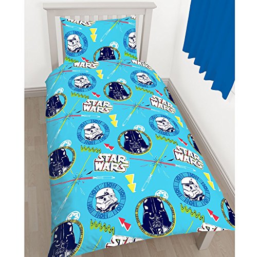 This awesome Star Wars Single Duvet Cover and Pillowcase Set has a reversible design featuring an illustrated style R2-D2, Darth Vader and Stormtroopers giving you two designs to chose from for one great, low price. This bedding set can be machine washed and tumble dried on a low setting. 0 |