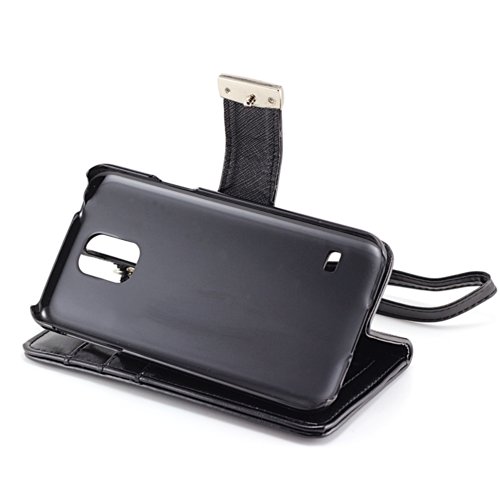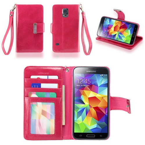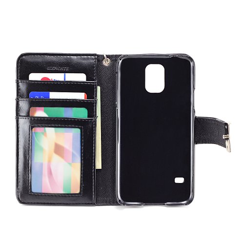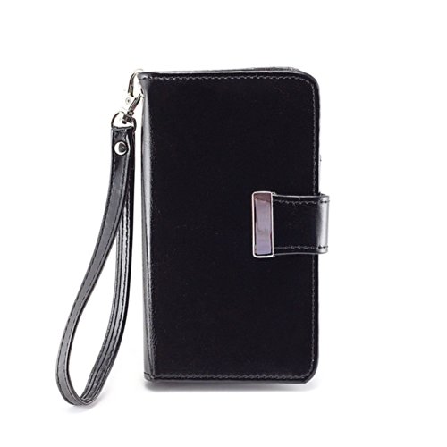 Built in backstand function with a simple flip and fold. Features 2 card slot pocket, 1 ID card slot pocket, 1 cash slot pocket, and a detachable strap.