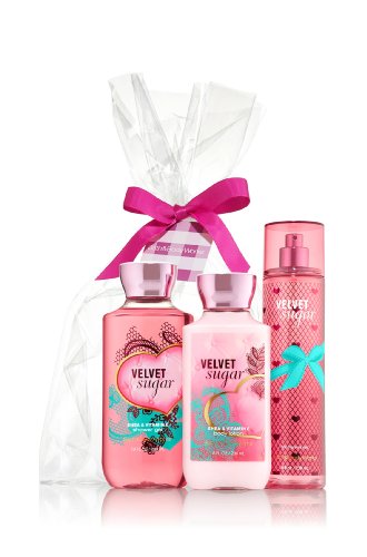 -. Feature : Notes: Wild Strawberries, White Nectarine, Pear Blossom, Apple Nectar / Notes: Pink Jasmine, Golden Plum, Red Velvet Créme, Dewy Honeysuckle, Freesia / Notes: Golden Amber, Vanilla , Tolu Balsam, Caramel, Baileys Créme, Sugared Musk / Full-Size Bottles (Trio with Cellophane, Ribbon & Gift Tag) / BATH AND BODY WORKS VELVET SUGAR.Body Lotion 8 fl oz just got better! With 2x the moisture and 3x the Shea, our enhanced lotion contains more of what skin loves, leaving it feeling incredibly soft, smooth and nourished. Fortified with nutrient-rich ingredients like protective Vitamin E and fast absorbing Jojoba Oil, our ultra-nourishing formula delivers 16 hours of continuous moisture Shower Gel 10 fl oz Wash your way to softer, cleaner skin with a rich, bubbly lather bursting with fragrance. Moisturizing Aloe Vera and Vitamin E Fine Fragrance Mist 8 fl oz Lavishly splash or lightly sP.R.Itz your favorite fragrance, either way you'll fall in love at first mist! .