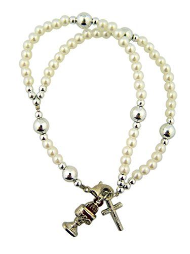 -. Title : White Acrylic Bead First Communion Rosary Bracelet with Chalice Medal, 7 Inch