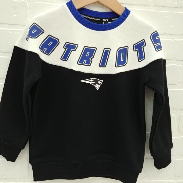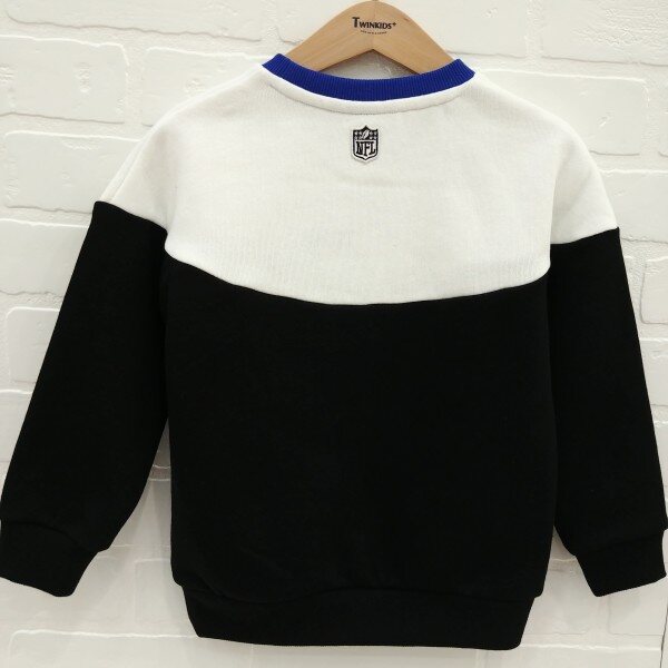 팀 로고와 마크 나염이 포인트인 라운드형 절개 맨투맨 티셔츠, 뒤 NFL엠블럼 와펜 자수도 들어감, 속기모가 있어 따뜻함.