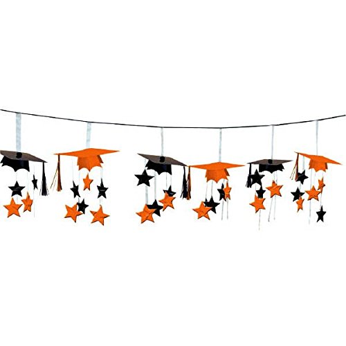 Amscan School Colors Graduation Party 3-D Mortarboard and Stars Foil Garland Decoration (1 Piece), Orange/Black, 12'