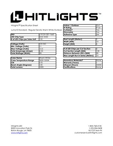 HitLights Weatherproof Warm White SMD5050 LED Light Strip - 150 LEDs, 16.4 Ft Roll, Cut to Length - 3000K, 123 Lumens per foot, IP65, Requires 12V DC