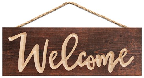 Welcome Script Brown Weathered 16 x 6 Inch Pine Wood Carved Hewed Hanging Sign