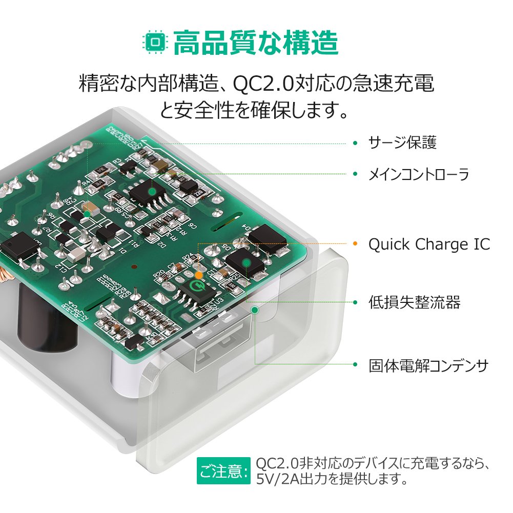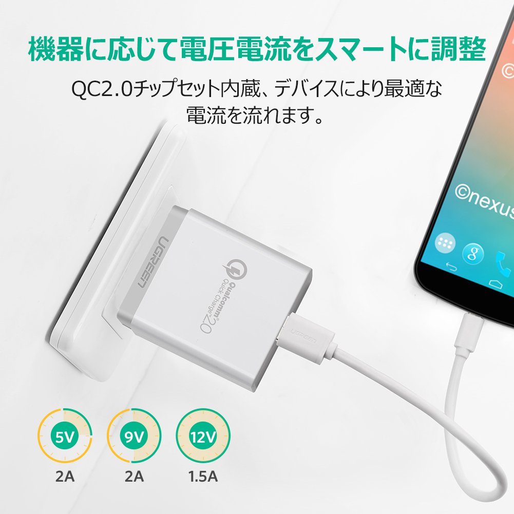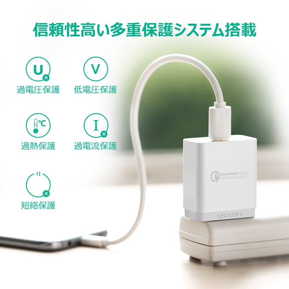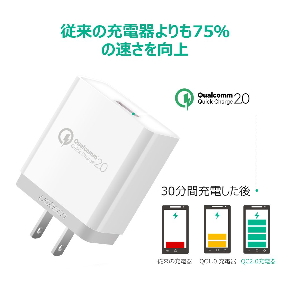 The UGREEN USB quick charger will be able to charge at high speed by raising the charge voltage (9 V) in accordance with Qualcomm Quick Charge 2.0 technology.