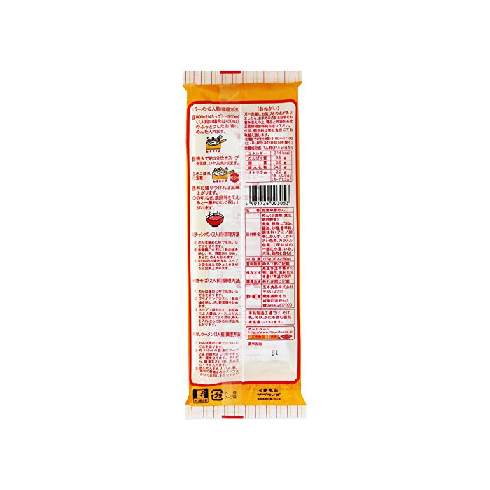 원재료:면(소맥분,식염,계란 흰자 분말)고, 식염,돈기름,참기름,간장,설탕,향신료,조미료(아미노산등)고, 물어 들이마시고, 치자나무 색소,카라멜 색소,(원재료의 일부에 밀,가고, 대두,닭고기를 포함한다)