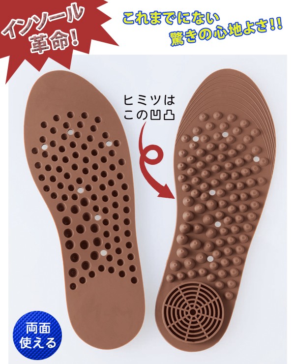 | 突起が気持ちいい凸面、やわらかい感触の凹面、両面とも使えて足裏快適なインソール(中敷き)。突起は足裏の形状に合わせて高さを変えしっかりフィット、地面からの衝撃を吸収してくれます。シリコン製の程よい硬さで足裏に心地よい刺激。体重のかかるかかと部分の負担も軽減してくれます。汚れたら水洗いOK。レディース用で足のサイズに合わせてハサミでカットできます。この気持ち良さ、ぜひ体感してください! |