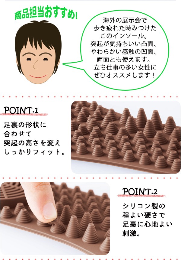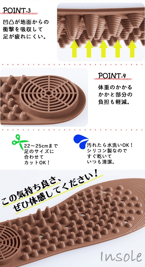 | 突起が気持ちいい凸面、やわらかい感触の凹面、両面とも使えます。突起は足裏の形状に合わせて高さを変えしっかりフィット、地面からの衝撃を吸収してくれます。シリコン製の程よい硬さで足裏に心地よい刺激。体重のかかるかかと部分の負担も軽減してくれます。汚れたら水洗いOK。足のサイズに合わせてカットできます。この気持ち良さ、ぜひ体感してください!レディース用/インソール/中敷き/シリコーン/マッサージ/足裏快適/ |