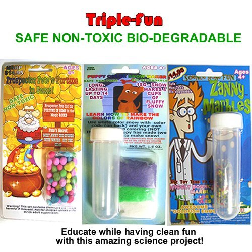 -. Feature : 3 set of science kits allow your young scientist to explore and learn the basics of science and have fun. Perfect for young science enthusiasts, especially those with an interest in science. / Zanny Marbles (Multi Color/5g) in Test tube Science gone fun.These beads are really cool wet and wacky, soft and squishy, fun and funky, bouncy and beautiful. They start off hard and tiny. Add water and watch them grow to more than 100 times their volume. While they grow have fun never ends. / PUPPY COLOR SNOW MAKER ; Instant Snow Powder: 15G-SNOW (Purple, Green and White) Kit Includes Test Tube w/ cap. WILL MAKE 6 CUP OF FLUFFY ARTIFICIAL SNOW LONG-LASTING UP TO 14 DAYS / Prospector Pete's Fortune in Gems: This is an amazing and fun toy for kids of all ages from 4 to 84. Grandparents/parents enjoy quality time when the kids with this toy. / Eco-Friendly SAFE NON-TOXIC BIO-DEGRADABLE Reusable up to 2 years.