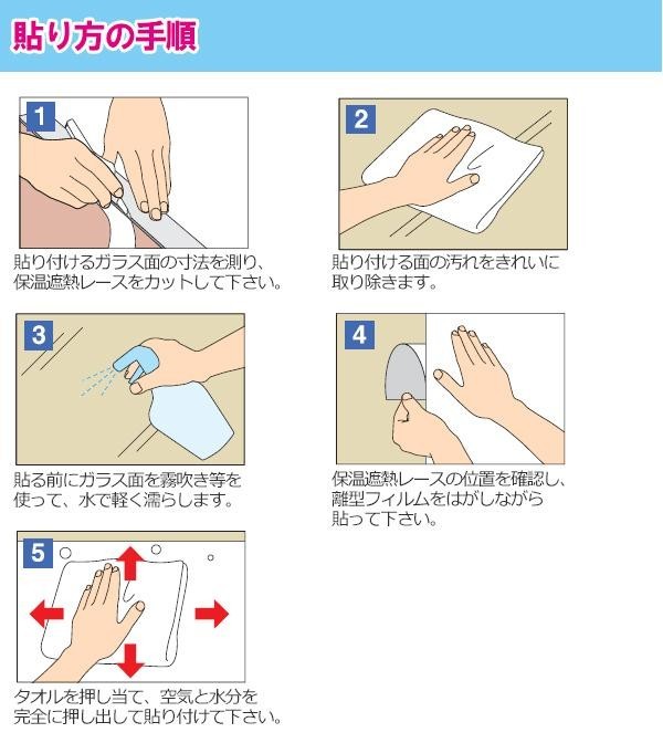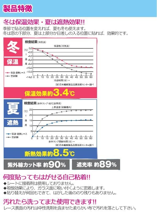 | 冬は保温、夏は遮熱効果のあるレースです。季節で貼る位置を変えれば、夏も冬もお使いいただけます。貼って剥がせて、のり残りもありません。 |