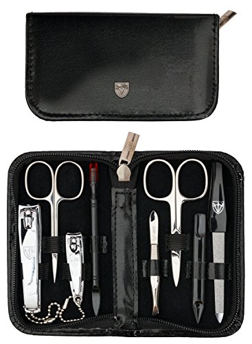 Surface of steel implements: bright nickel plated, polished | Case: Synthetic leather • black • Delivered in an attractive THREE SWORDS gift box • Made in Solingen/Germany since 1927 (except nail clipper/s)