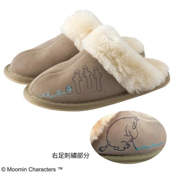 | スリッパのサイドに施されているニョロニョロとムーミンの刺繍が魅力的♪足裏・つま先・甲部分までふわふわのファーを贅沢に使用しました。まるで柔らかな絨毯の上を歩いているような履き心地に♪ |
