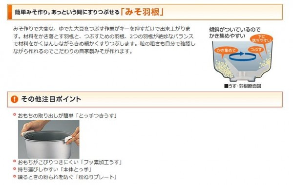 | きめ細かくすりつぶす「みそ羽根」もついているので、みそも作ることができます。 |