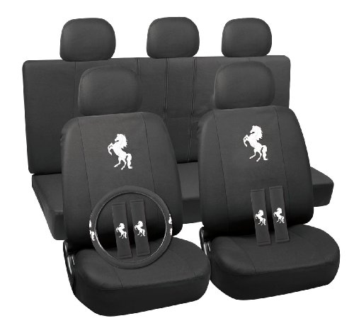 - Feature : 17pc White Mustang Logo Seat Cover Set w/ 4pc Black Carpet Mat Set for Front and Rear Chairs / Seat Cover Set includes Head Rest Cover, Seat Belt Pads, and 15" Universal Steering Wheel Cover / Comfortable Black Carpet Floor Mats for Cars and SUVs / Includes two 26" x 17" Front Mats and two 13" x 17" Rear Mats / Easy-to-clean mats feature Water Absorbant Heel Pad and Anti-Slip Backing