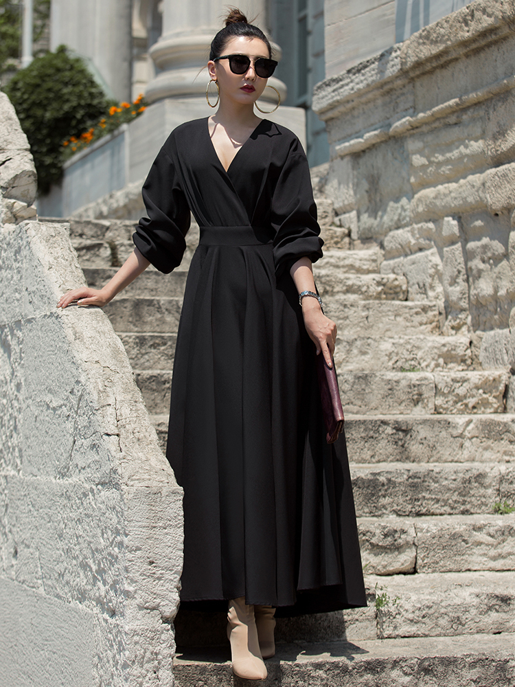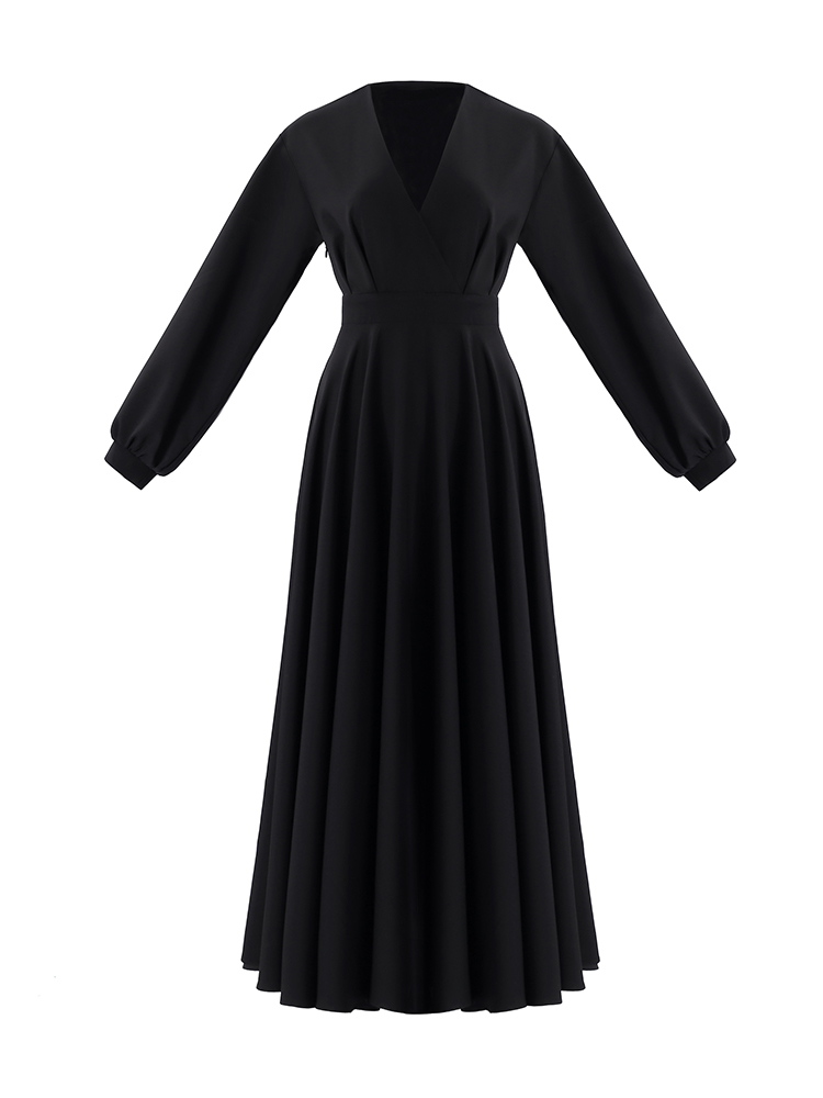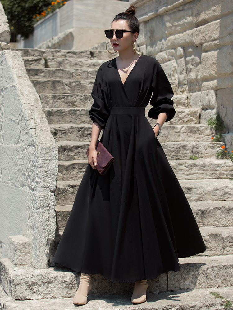 ワンピース 春夏 長袖 ドレス 二次会 お呼ばれドレス Aライン ロング丈 Vネック フレアスカート