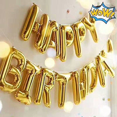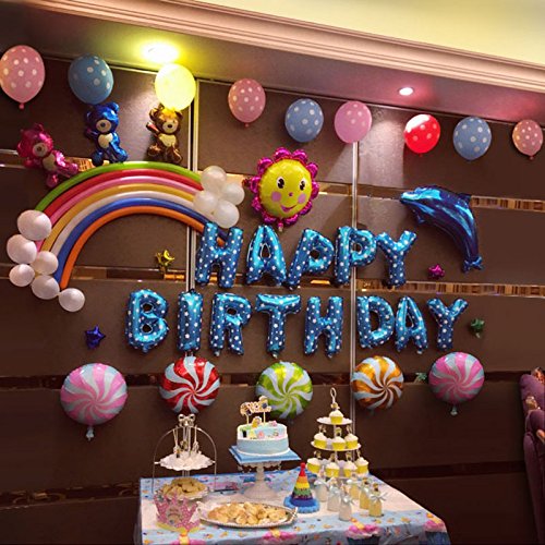 -. Feature : 1. Premium birthday party All-in-One pack has all the party supplies and party decorations. Easy to Carry. This beautiful balloons set is great for birthday party, wedding, holiday, business, celebrations and other on-site decoration. / 2. Each Set Includes: 13 pieces of letter balloons in ''HAPPY BIRTHDAY'' shape( multi-color), 6 pieces of round candy lollipop balloons(6 colors); 1 piece of sunflower balloon; 1 piece of balloon in rainbow with star shape; 1 piece of triangular flag banner; 100 pieces of balloon stickers. / 3. High Quality Material: All balloons are made of durable aluminum foil membrane, they can be repeated use, convenient inflation and deflation. Simply insert the straw into the valve at the bottom and slowly blow to inflate. When the balloon is sufficiently inflated, pull out the straw and pinch the self sealing valve. / 4. Hang Balloons On Wall: To put up balloons, use tape to attach the balloons to the wall or hang from the ceiling. 100 pieces of round seamless tape is included in 5 paper. / 5. Size of Balloons Before Blowing: Each letter balloon measures 16'', each round lollipop balloon measures 18''(45cm X45cm), sunflower balloon size is 59cm X62cm, rainbow with star balloon size is 45cm X33cm. Whole size of triangular flag banner is 230cm X20cm.