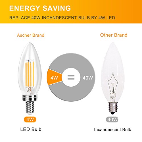 - ENERGY SAVING: Ascher 4W LED candelabra bulb serves as a prefect replacement for a 40W incandescent bulb. save over 90% on electricity bill of lighting.