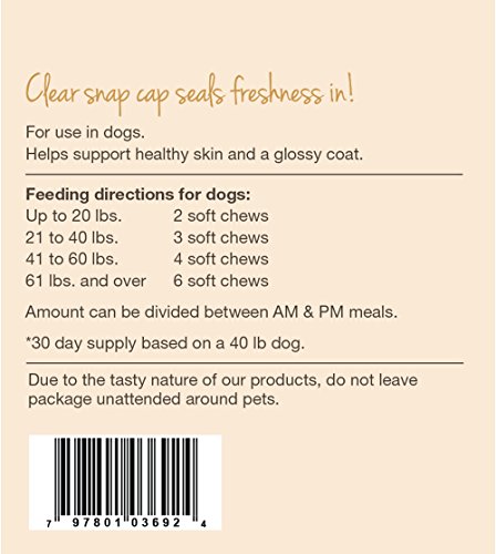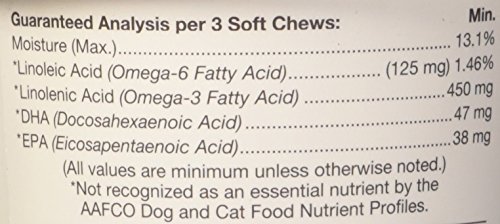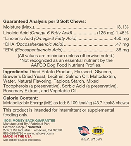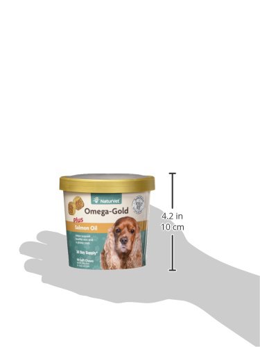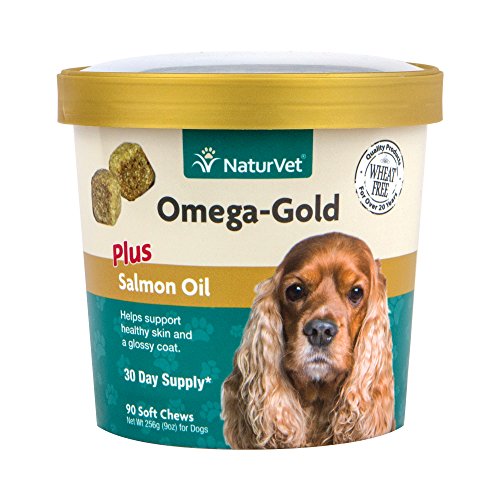NaturVet Omega-Gold Plus Salmon Oil Supports Healthy Skin and a Glossy Coat. Omegas Plus Salmon Oil Help Maintain Normal Moisture in Dry Skin. Excellent Source of DHA and EPA. Wheat Free, Tasty Soft Chews 90ct for Dogs, 30 Day Supply Based on a 40 lb. Dog. Guaranteed Analysis per 3 soft chews: Linoleic Acid (Omega-6 Fatty Acid), Linolenic Acid (Omega-3 Fatty Acid), DHA and EPA. All NaturVet Products are Veterinarian Formulated and Manufactured in the USA in an FDA Audited, cGMP Compliant Facility with a 100% Satisfaction Guarantee.Feature