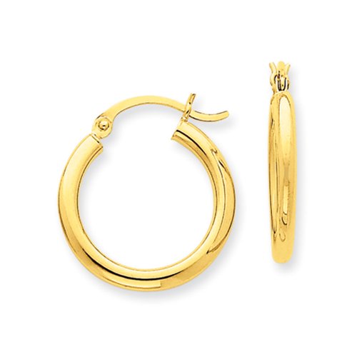 Simple and classic, our polished14k yellow gold round hoops feature a hinged post and a lightweight, hollow tube design that measures 2.5mm thick by 25mm (1 inch) in diameter.