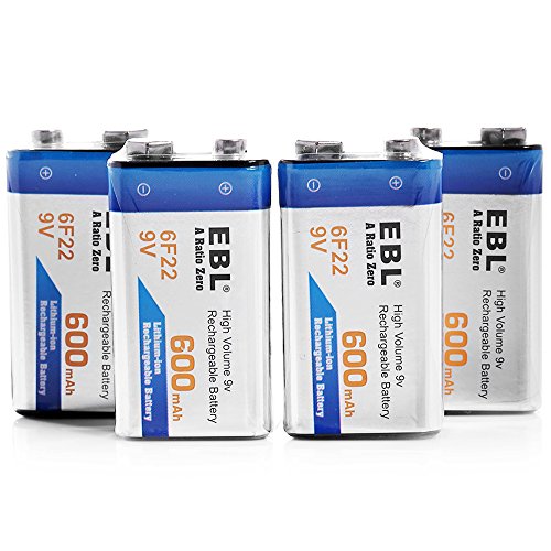 EBL 4 Pack 9V 6F22 600mAh High Volume Lithium-ion Rechargeable 9 Volt Li-ion Batteries