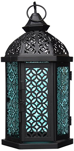 -. Feature : Beautiful blue pressed glass accents this six-sided candle lantern. / Intricate cutouts through the iron crown and side panels. / Hinged door for access to candle. / Hang from top loop or set on a table. / 5.75 x 5 x 11.5 inches tall, iron and glass, candle not included