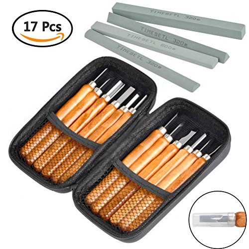 TIMESETL 17Pack Small Wood Carving Set, 12pcs Wood Carving Tools SK2 Carbon Steel + 4pcs Whetstone + 1pcs Reusable Pouch for Beginners Kids Adults DIY Woodworking Sculpting Whittling with Safety Cap