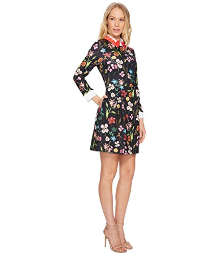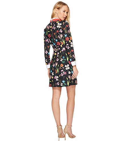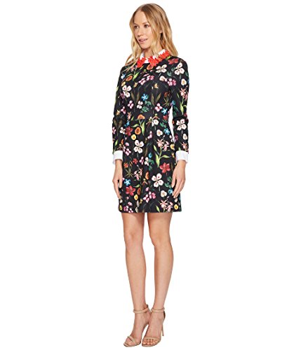 The tiller dress features an embellished collar and an all over floral print. It hits right above the knee and has full length cuffed sleeves.