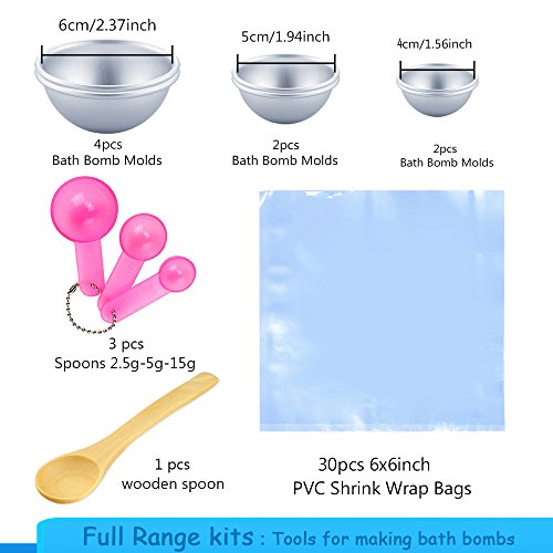 - Bath Bomb Mold Simple Set: 1pcs Cylinder Plastic Box, 2pcs 1.56 inch Bath Bomb Molds, 2pcs 1.94 inch Bath Bomb Molds, 4pcs 2.37 inch Bath Bomb Molds, 30pcs Shrink Wrap Bags, 3 packs Spoons 2.5g-5g-15g, 1pcs Wooden Spoon, 1 pack Instructions; Simple suit to meet your needs