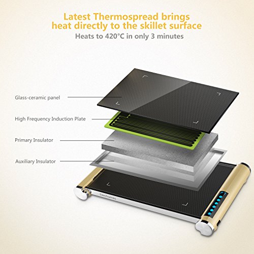 Elechomes' latest Thermospread technology uses a twin layer of insulators under the conductor to direct energy directly to the surface top, enabling the skillet to go from cool to a crackling 400°F in just 4 minutes.