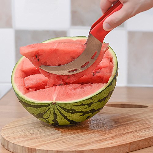 HASSLE-FREE CLEAN UP: Forget watermelon juice leaking all over your kitchen counters. The watermelon knife slicer server helps you extract watermelon pieces intact, without crushing fruit meat or draining it of its delicious juice. Our watermelon knife tool helps you reduce fruit waste and minimize clean up, as all melon juice remains contained within the fruit’s rind.