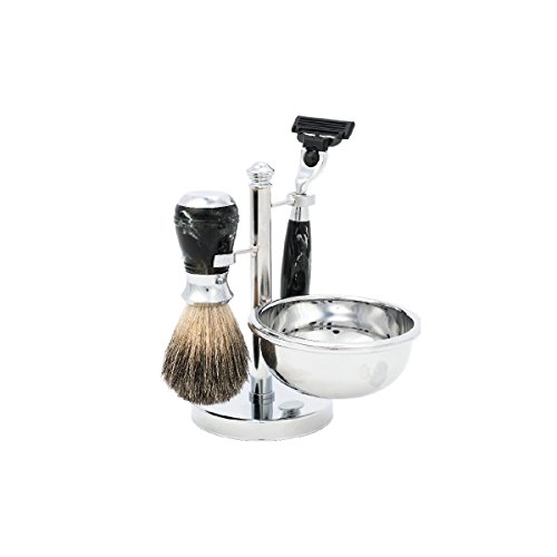 - Beautifully-crafted 4-piece set includes Razor, shaving brush, barber bowl, and stand