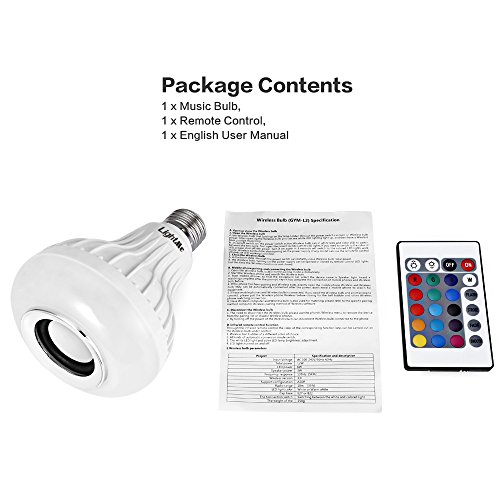 Specifications: Bluetooth version: Bluetooth 3.0 Bluetooth configuration: A2DP Wireless control distance: No less than 10m Bluetooth receiver distance: About 10m Light color: White RGB Power: 12W (LED speaker) Speaker power: 3W Input: AC 100 - 240V 50 - 60Hz Frequency response: 135Hz - 15KHz Shell material: Engineering plastic Remote control: 24 keys, built-in 1 x 3V CR2025 lithium button cell Holder: E27 Type: Ball Bulbs Output Power: 12W Emitter Type: LED Total Emitters: 1 Voltage (V): AC 100-240 Angle: 160 degrees Lifespan: 50000 hours Features: Remote-Controlled Function: Home Lighting Available Light Color: as the instructions Package weight: 269g Package size (L x W x H): 11.00 x 11.00 x 15.00 cm / 4.33 x 4.33 x 5.91 inches