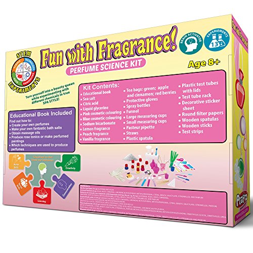 Studio : Playz Publisher : Playz Binding : Toy Product Description Perfume Factory Science Experiment Kit by Playz engages children in fine motor skills, new vocabulary, concentration while having fun with perfume science projects! STEM stands for Science, Technology, Engineering and Mathematics and is an education grouping used worldwide. This kit contains a 36 page educational book that guides kids through each of the 13 experiments. Explore how to create your own perfumes, make your own bath salts, how to produce rose tonics, make perfumed paintings and more! Kids will love boosting their brain power during play time. This kit is recommended for ages 8 and up and requires adult supervision for safe play. 0