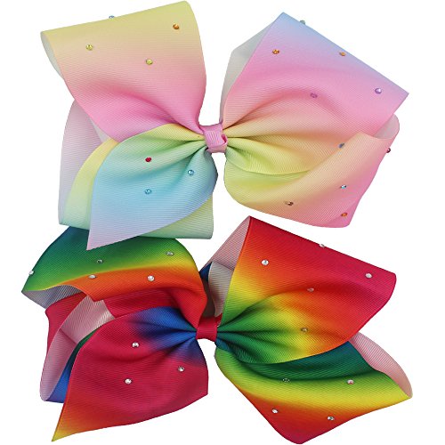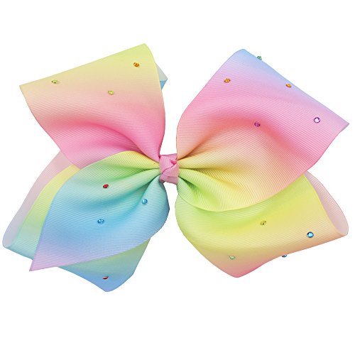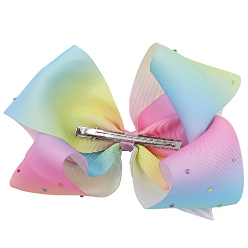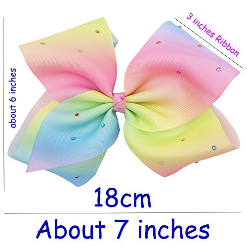 -. Feature : Hair Bows Size: Width 7"(18cm) which is made of 3" rainbow ribbon;Alligator Metal Clips: 3" (8cm) / Extra Large Bow Clip for Teenager Girls,Little Girls,Kids,Cheerleader,Women,Toddlers and Newborns' Headband. / DURABLE METAL ALLIGATOR HAIR CLIPS: Besides having only top notch grosgrain ribbon quality, these hair clips bear strong and durable metal alligator clips as well. They are firmly hot glue attached so as to offer you great comfort and stability while wearing. You may rest assured that they won't slide or slip from your hair no matter how hard you are dancing or how thick or thin your hair is. Pure perfection right? / Vivid Colors won't fade.The newest rainbow color with rhinestones make the hair accessories more attractive.The best gift for your girls and your friend.They fit every occasion.and especially Mother and daughter fitted. / MATCH ANY OUTFIT HAIR CLIPS WITH MONEY BACK GUARANTEE: One of the greatest things about these ribbon hair clips besides the quality grosgrain fabric and resilient alligator clip, is the fact that you can wear them with any outfit that you want. Is it a sundress or a swimsuit, baggy jeans or slimming tights, sandals, flip flops or peep toes? You name it and they will match all of your outfits. Just in case you experience any issues with our product feel free to return it and get your money back.