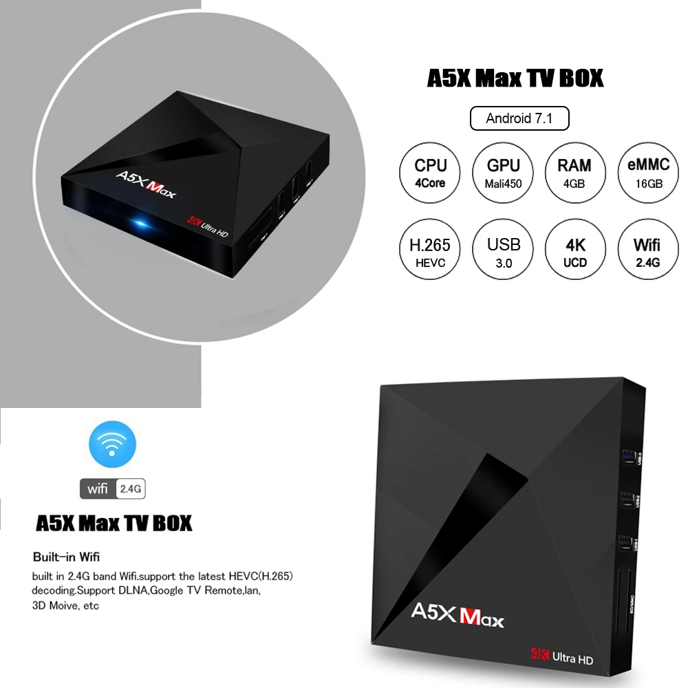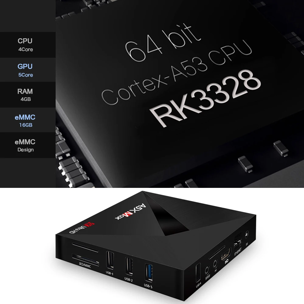 Powered by high-performance RK3328 Quad-Core CPU・ A5X Max will be able to play 4K videos with H.265・ H.264 and VP9 codecs. It also features HDR 10・ HD 2.0a・ USB3.0 and a Penta-core Mali-450 GPU.
