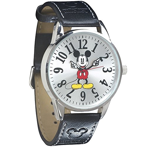 -. Binding : Apparel -. Brand : Disney -. Color : Black -. Department : unisex-adult -. EAN : 0660392826536 -. Feature : Mickey's gloved hands mark the hours and minutes. / Silvertone case and large face with oversized numbers. / Black leather band topstitched in white. / ImP.R.Inted with Mickey ears outline. / Face is 1.5" diameter. Band is 9" long. -. Label : Disney -. Manufacturer : Disney -. Model : 57008 -. MPN : 41546 -. PackageQuantity : 1 -. PartNumber : 41546 -. ProductGroup : Apparel -. ProductTypeName : ACCESSORY -. Publisher : Disney -. Studio : Disney -. Title : Disney Watch Mickey Mouse Jumbo Round Face Black Band Style -. UPC : 660392826536