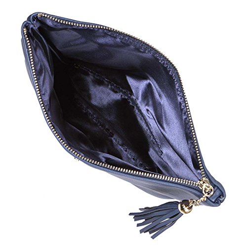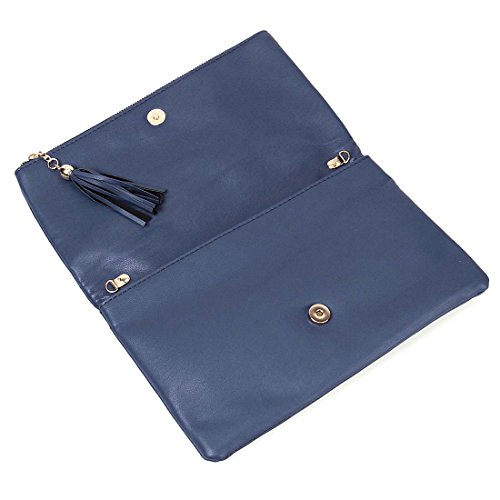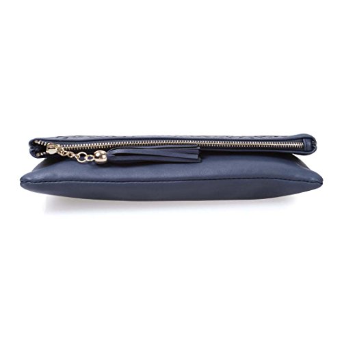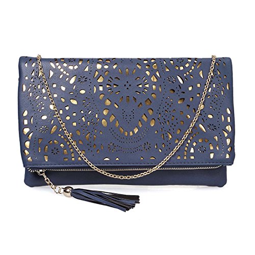 This navy blue perforated foldover clutch has a beautiful gold background to accentuate the cut out pattern. The deep main compartment folds over to make this a standard clutch. The additional exterior pocket ensures that you have more than enough room for all of your essentials. A removable metal chain transforms this clutch into a shoulder bag. The tassle adorned zipper adds a stylish touch to this already fashionable handbag. *NOTE*: Due to differences between monitor displays, actual color may vary slightly from image. b.m.c is a registered trademark of Remi Collections LLC and is exclusively distributed by Bundle Monster. The b.m.c trademark is protected by US Trademark Law.Feature