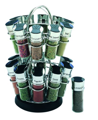 -. Feature : Filled with 20 Favorite Spices / Glass and Chrome jars / Each Jar is Labeled for easy Use / Saves Countertop Space / Fully Assembled