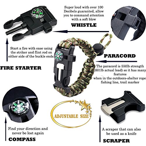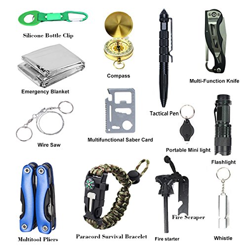 - ❤️ 【NEW 2018 UPGRADED 14-IN-1 EMERGENCY SURVIVAL KIT】Uniquely customized by US military VETERANS to get you well-prepared in advance of emergencies, including 14 essential versatile tools : Paracord Survival Bracelet, 9 Function Multi-Tool Plier ,Tactical Self-Defense Pen, 3 Mode Flashlight, Keychain Light, 11 Function Saber Card, Night Visible Luminous Compass, Tactical Folding Knife ,2-Tune Whistle, Fire Starter,Fire Scraper, Wire Saw, Emergency Blanket, Water Bottle Clip.