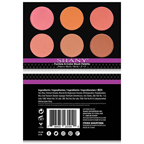 Fuchsia by SHANY is for blush lovers with combination of 6 peachy-pinky colors. Colors are great for everyday use and can be combined with any other shany palette. Pans are large enough to last you a long time, durable compact kit is great when you are on the go and the kit fits in any purse. color combination is unlimited, so let your imagination run wild and blend your perfect color by Fuchsia today. Colors are highly pigmented and stored in temperature controlled facility, wont crack, and wont melt. try it today to see the difference.Feature