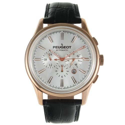 -. Binding : Watch -. Brand : Peugeot -. Color : black -. Department : mens -. EAN : 0734213910039 -. Feature : Round watch with pearlescent dial, placed indices, three subdials, date window, and fluted crown / 46 mm rose gold-tone stainless steel case with mineral dial window / Automatic self-wind movement with analog display / Featuring leather calfskin band with buckle closure / Water resistant to 10 m (33 ft) -. Label : Peugeot -. Manufacturer : Peugeot -. Model : MK910RBK -. MPN : MK910RBK -. PartNumber : MK910RBK -. ProductGroup : Watch -. ProductTypeName : WATCH -. Publisher : Peugeot -. Size : NO SIZE -. Studio : Peugeot -. Title : Peugeot Men's MK910RBK Rose Gold-Tone Stainless Steel Watch with Textured Black Band -. UPC : 734213910039