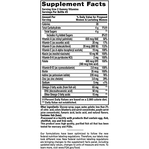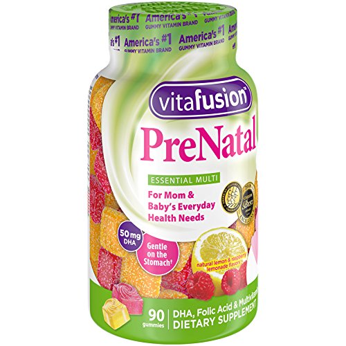As the #1 prenatal gummy vitamin†, Vitafusion PreNatal multi provides essential vitamins and minerals for pregnant and lactating women. Each serving provides 100% DV folic acid, 50 mg Omega-3 DHA, Best of all, these great-tasting, natural fruit flavored gummies contain no iron, making them easy on the stomach.Feature