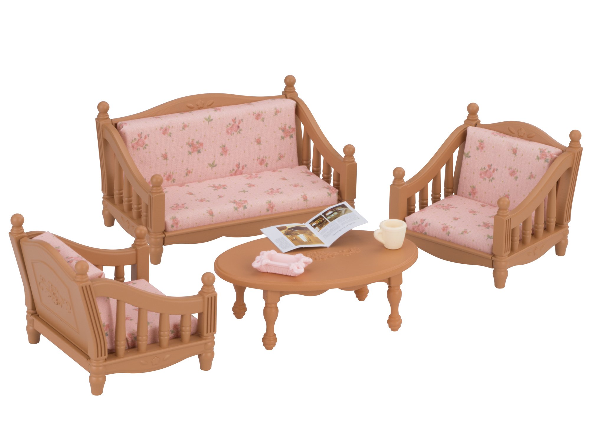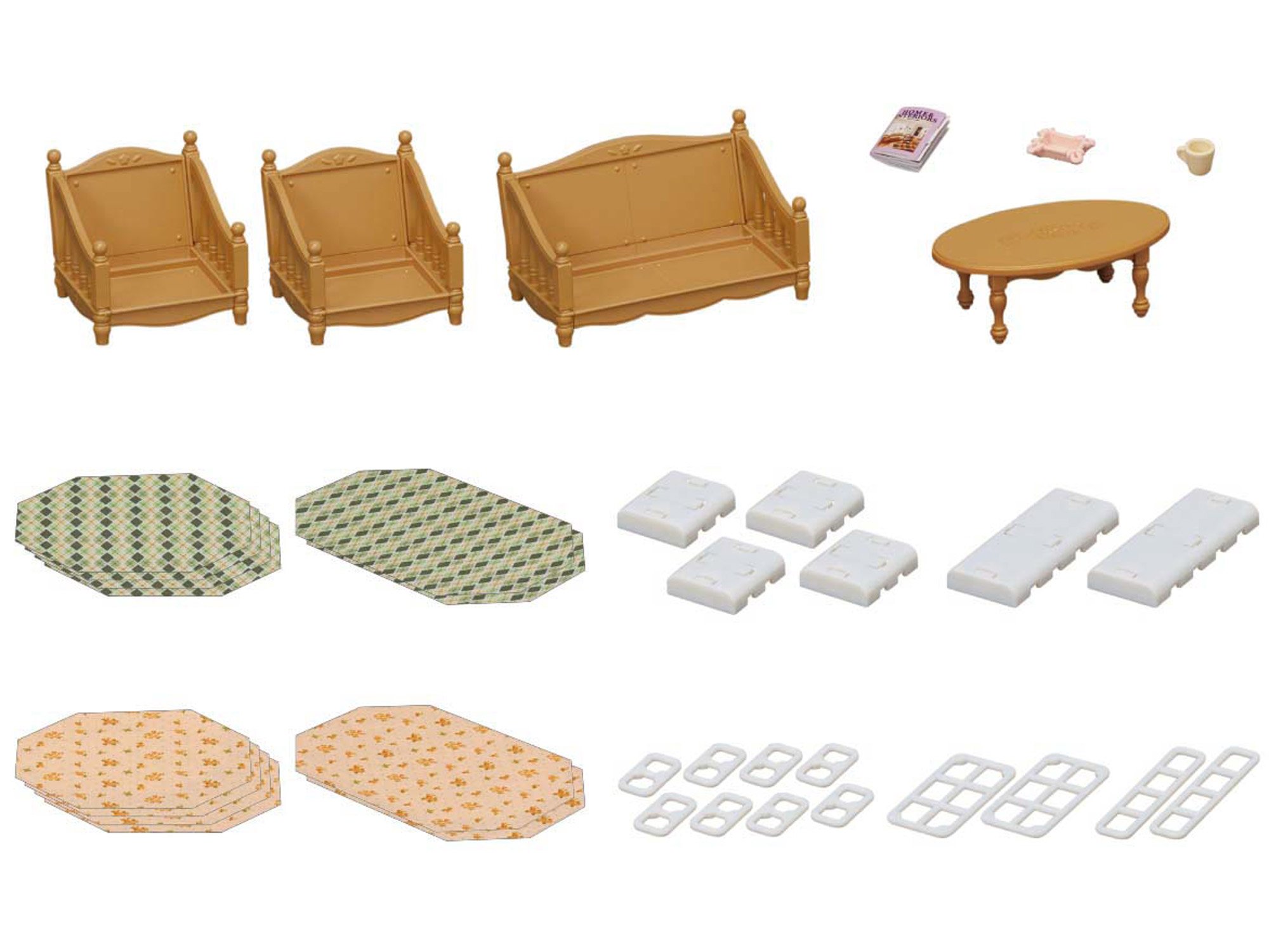 Sofa, armchair x 2, table, accessories, mugs, magazines, replacement cloth (for sofa) x 2, replacement cloth (for armchair) x 4 (total number of parts: 13)