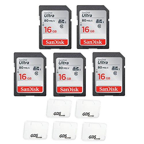 5x Genuine SanDisk Ultra 16GB Class 10 SDHC Flash Memory Card Up To 80MB/s Memory Card (SDSDUNC-016G-GN6IN) with slim memory card case (5pcs)