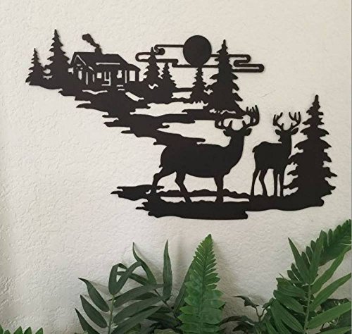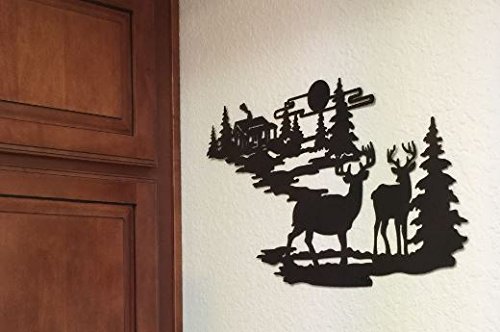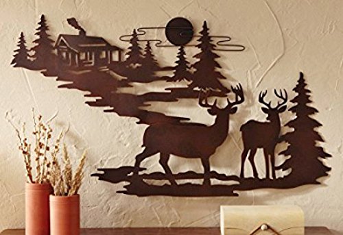 - EACH SET INCLUDES A PRECISION CUTOUT of a Mountainous Pine Forest, Clouds, Sun, Mountain Cabin, and a Pair of Majestic Deer Foraging in the Woods. HIGH QUALITY PRODUCT -Each Piece is Made of Forged Iron and Measures 24" in Length, 13 3/4" in Height and is .1" Thick.
