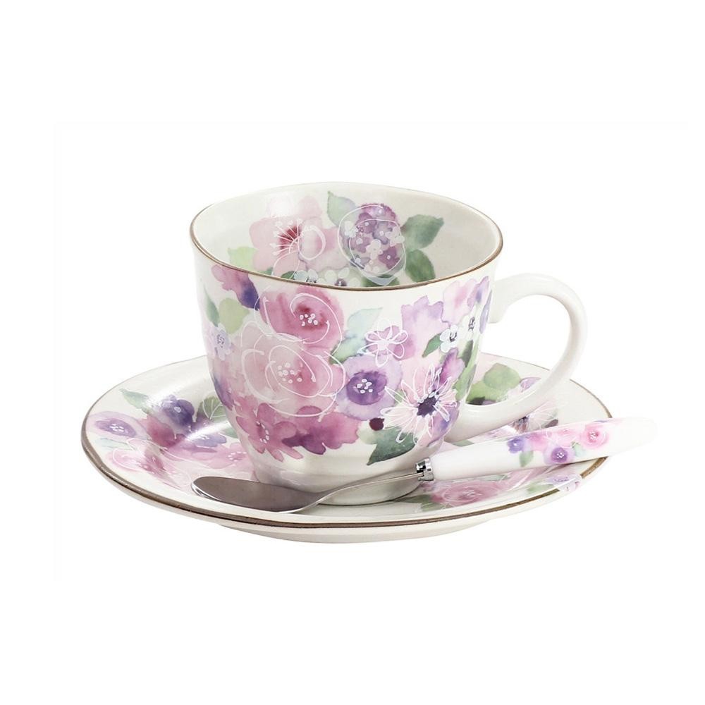 「花工房」のピンク花柄が描かれたコーヒー碗皿&スプーンのセットです。