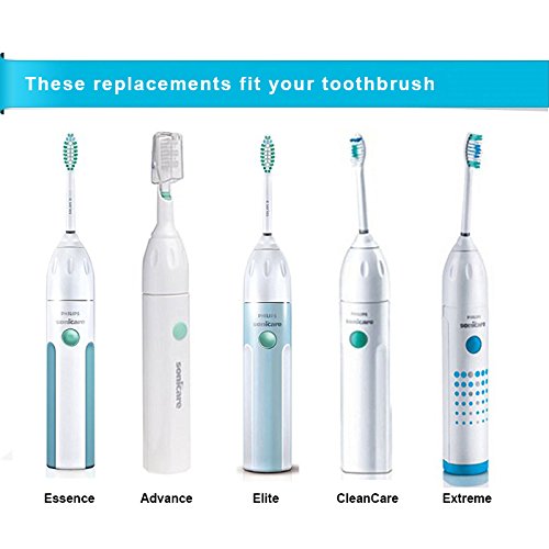 The replacement brush heads for Philips Sonicare are compatible with all of the following handle models: HX3xxx: HX3300, HX3351, HX3500, HX3551, HX3881; HX4xxx: HX4002, HX4101, HX4011, HX4321, HX4772; HX4511, HX4572, HX4573, HX4772, HX4871; HX4872, HX5130, HX5251, HX5300, HX5310; HX5xxx: HX5350, HX5351, HX5352, HX5400, HX5451; HX5500, HX5551, HX5581, HX5610, HX5611; HX5751, HX5752, HX5754, HX5810, HX5853; HX5910, HX7001, HX7012, HX7023, HX7022; HX7xxx: HX7052, HX7053, HX7351, HX7361, HX7381; HX7551, HX7553, HX7800, HX7841, HX7881; HX9xxx: HX9500, HX9552, HX9553, HX9562, HX9842; HX9882,etc. Other:Advance e-4000/Essence e-5000/Elite e7000/e9000/Xtreme/e3000 These Great Value Tech e-Series replacement heads fits Sonicare models: Advance, Essence, Elite, CleanCare, and Xtreme. There Angled Neck and Contoured Bristles for Comfortable Use and contoured bristles that correspond to the natural shape of your teeth. These toothbrush heads deliver a thorough, comfortable brushing experience. The angled neck provides optimal reach for the bristles, which have soft rounded ends that gently massage your gums and go deep between teeth to remove plaque. Replace Every Three Months You can't see it, but your brush head wears over time. The bristles have indactors that will fade in color to let you know when it's time to replace the brush head. Brush Heads Screw On for Easy Replacement and Cleaning . They can be easily removed for cleaning and replacement. The heads come with caps for hygienic storage and travel. The The e-Series Standard brush heads work with the following Sonicare models: Advance, Essence, Elite, CleanCare, and Xtreme Elite e7000 e9000 series Essence e5000 5300 5500 5700 5750 series Advance a4000 series Xtreme e3000 seriesFeature
