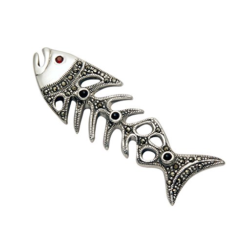-. Title : Sterling Silver & Marcasite Fish Skeleton Pin w/Simulated Onyx & Faceted Red Crystal Eye
