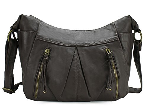 -. Feature : High quality synthetic washed leather with fabric lining. / Classic bronze-toned hardware. Two front zipper pockets. / Interior cell phone pocket, multifunctional slip and side zipper pocket. / Adjustable shoulder strap drops 24". / Size: 9.3"x8.8"x3.8"