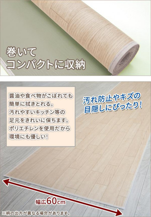食べ物や飲み物がこぼれても簡単に拭きとれるロングマットです。汚れやすいキッチン等の足元をきれいに保ちます。汚れ防止や傷の目隠しにも。使わない時は巻いてコンパクトに収納できます。 |